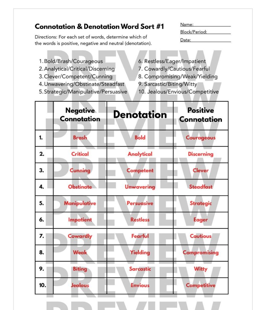 Connotation vs. Denotation Handouts (Teachers Pay Teachers)